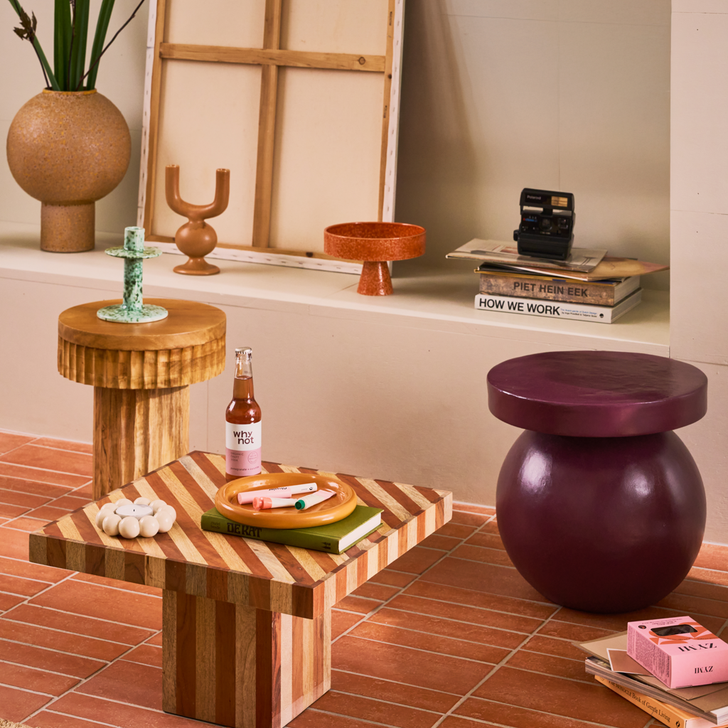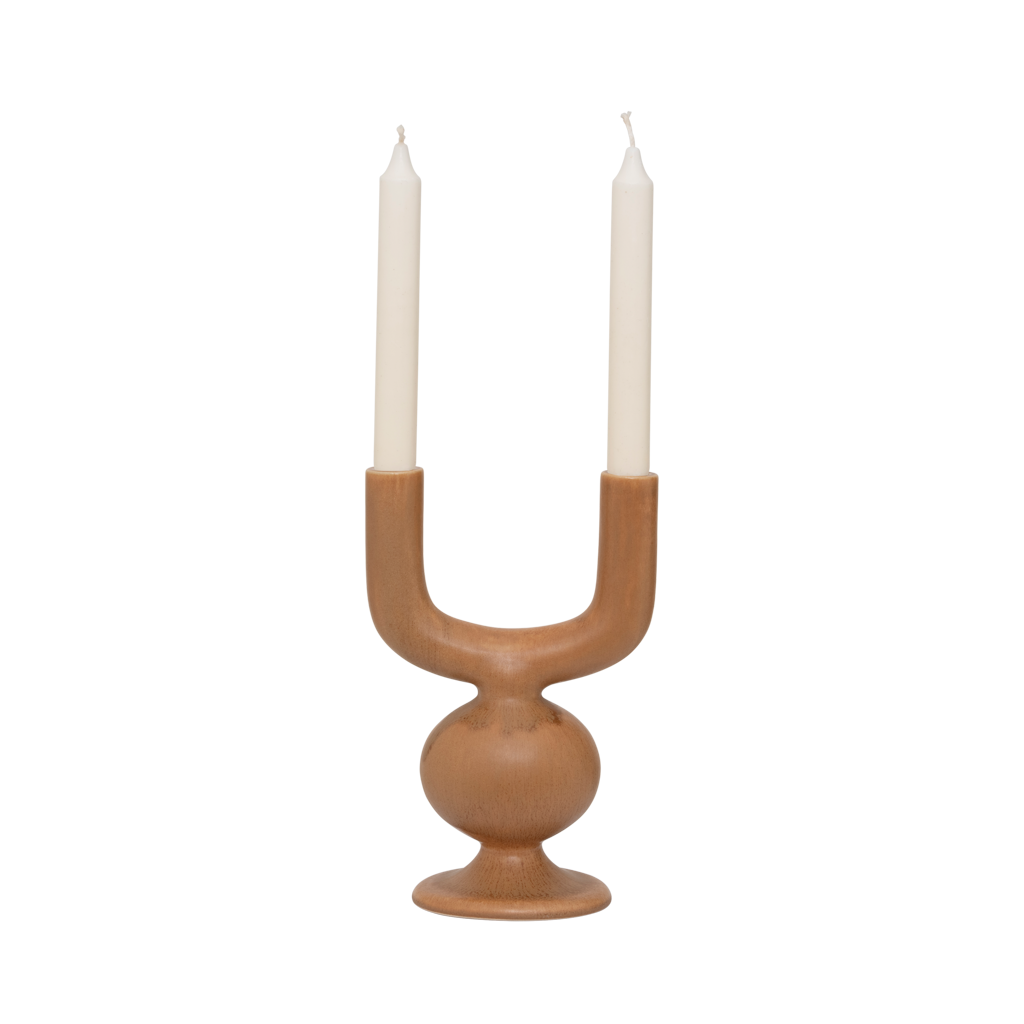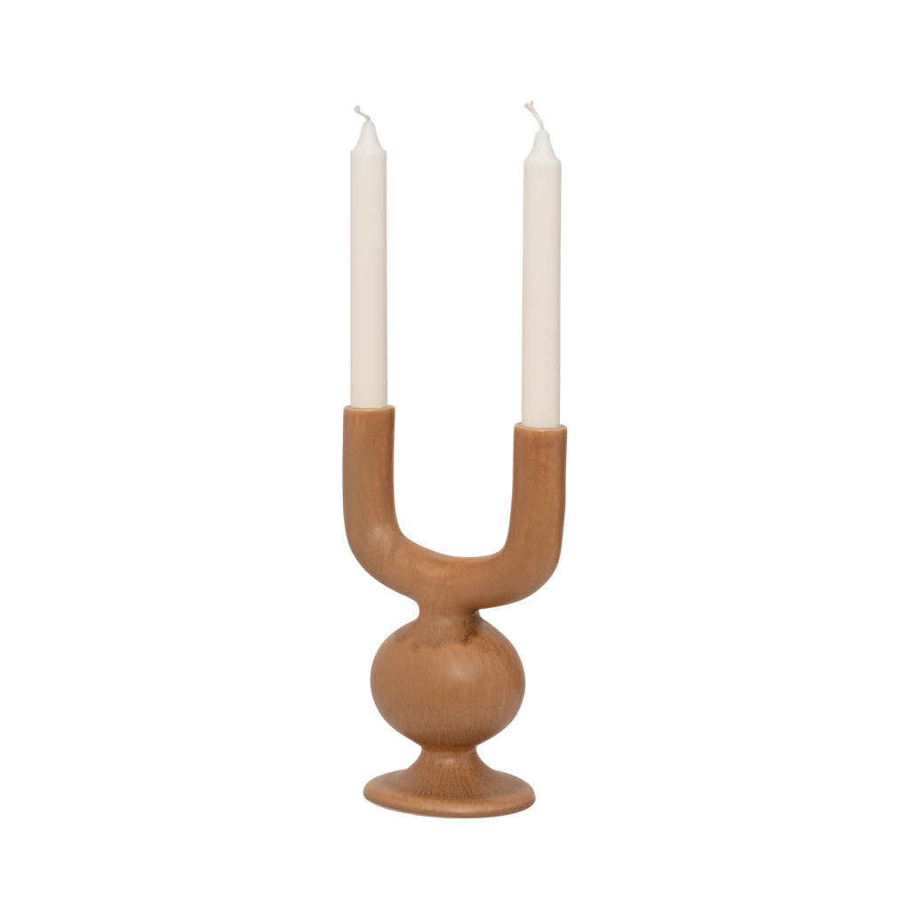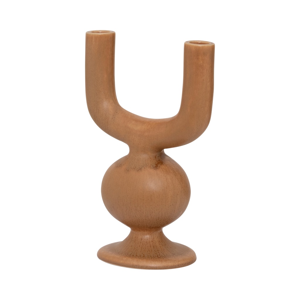 This two-candle holder in golden brown features a central spherical design that adds depth and character to your home décor. Crafted from sustainable ceramic, it combines sturdy elegance with a refined silhouette. A charming candle stand that brings personality and style to any space.