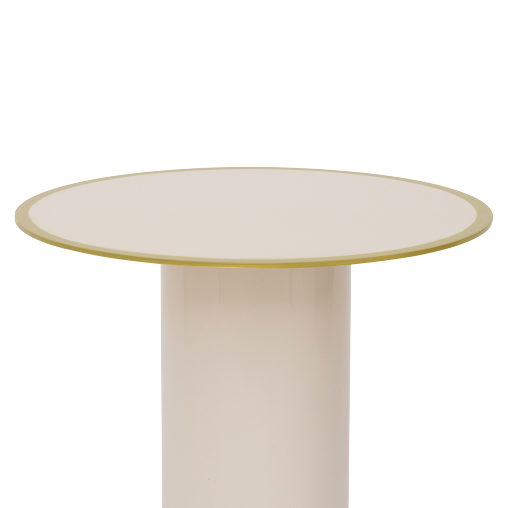 With a straight base and slim tabletop, this iron side table in colour almond milk adds a urban touch to any space. The evergreen sprig edge brings a hint of freshness, while the glossy iron gives it a sleek neutral look