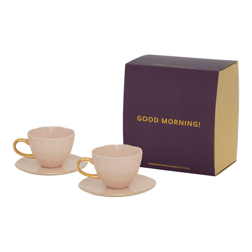 Urban Nature Culture’s Good Morning series adds a golden lining to each morning. The instantly recognisable golden accent, along with the hand-painted design adds a luxury feel to each breakfast, no matter if you’re turning it into a breakfast party with friends, or having a quick bite before the daily race kicks off. For the 2025 Spring and Summer collection, Urban Nature Culture brings new tableware to life in the Good Morning old pink colour – a set of 4 in a flamboyance gift pack, 2 cups and 2 plates. Care instructions: Handwash only, to protect the handpainted gold.