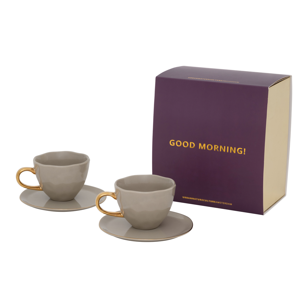 Personne du matin ou adepte du snooze, petit-déjeuner rapide dans la cuisine ou profiter d'un petit-déjeuner de luxe dans la salle à manger, la Good Morning Cup d'Urban Nature Culture est un excellent moyen de commencer votre journée. Faisant partie des collections d'UNC depuis le tout début, son bel accent doré fait vraiment de cette série de vaisselle un chez-soi. Pour cette collection, Urban Nature Culture vous présente fièrement le coffret cadeau Good Morning Cup Cappuccino/Thé et Assiette – avec deux tasses bien-aimées et deux assiettes en Gray Morn. Un excellent cadeau de crémaillère ou d'anniversaire – pour les autres et pour vous. Commencez votre journée avec un sourire.
