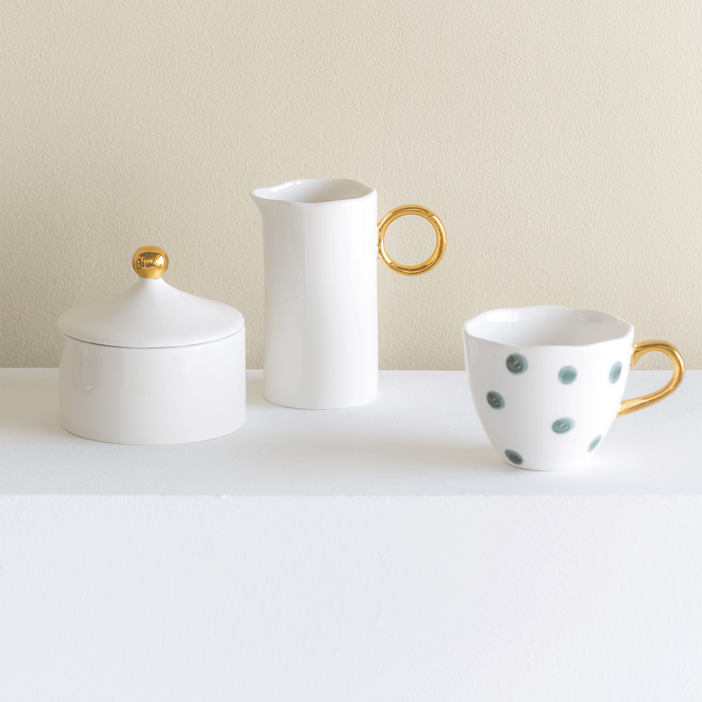 La série Good Morning d'Urban Nature Culture ajoute une touche dorée à chaque matin. L'accent doré immédiatement reconnaissable apporte une sensation de luxe à chaque petit-déjeuner, que vous le transformiez en fête du petit-déjeuner avec des amis ou que vous preniez une bouchée rapide avant le coup d'envoi de la course quotidienne. Faisant partie de la série, la toute nouvelle couleur de brin de feuillage éternel, dans laquelle Urban Nature Culture donne vie à une tasse à café en céramique. La mise en scène de la table n'a jamais été aussi facile avec des assiettes assorties pour créer l'unité. Instructions d'entretien : Lavage à la main uniquement - pour protéger la bordure dorée.
