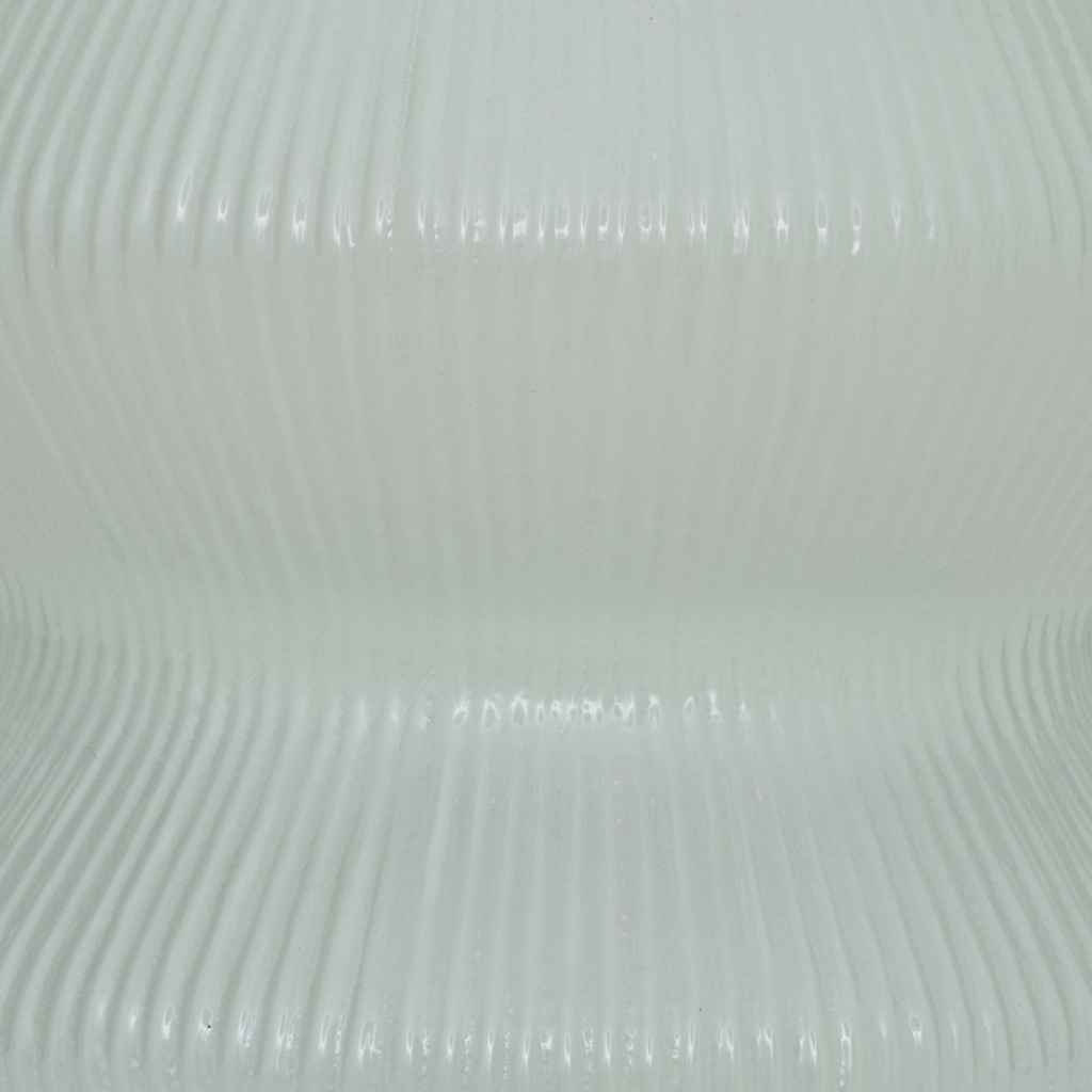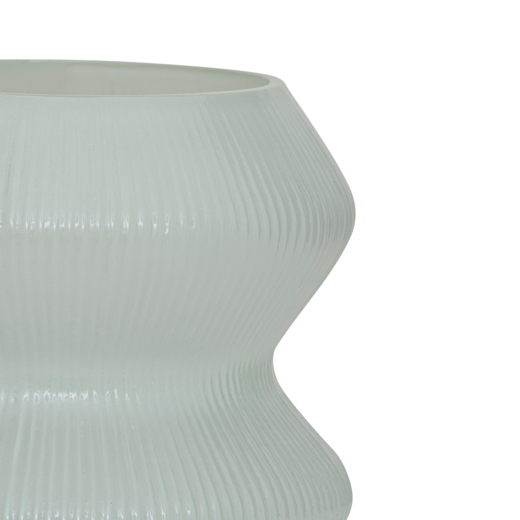 Een theelichthouder in een ondoorzichtige kleur sea foam, die een serene kustsfeer in je interieur brengt. Gemaakt van gerecycled glas, met een golvende vorm en verticale fijne ribbels die het ritme van de zee weerspiegelen. Een charmant accessoire dat van elk kaarslichtmoment een ontspannen belevenis maakt.